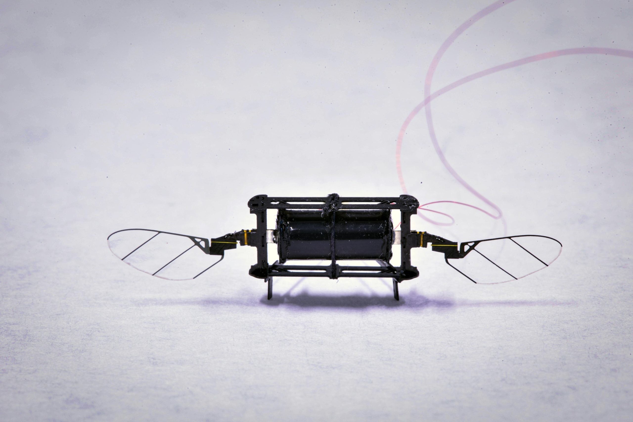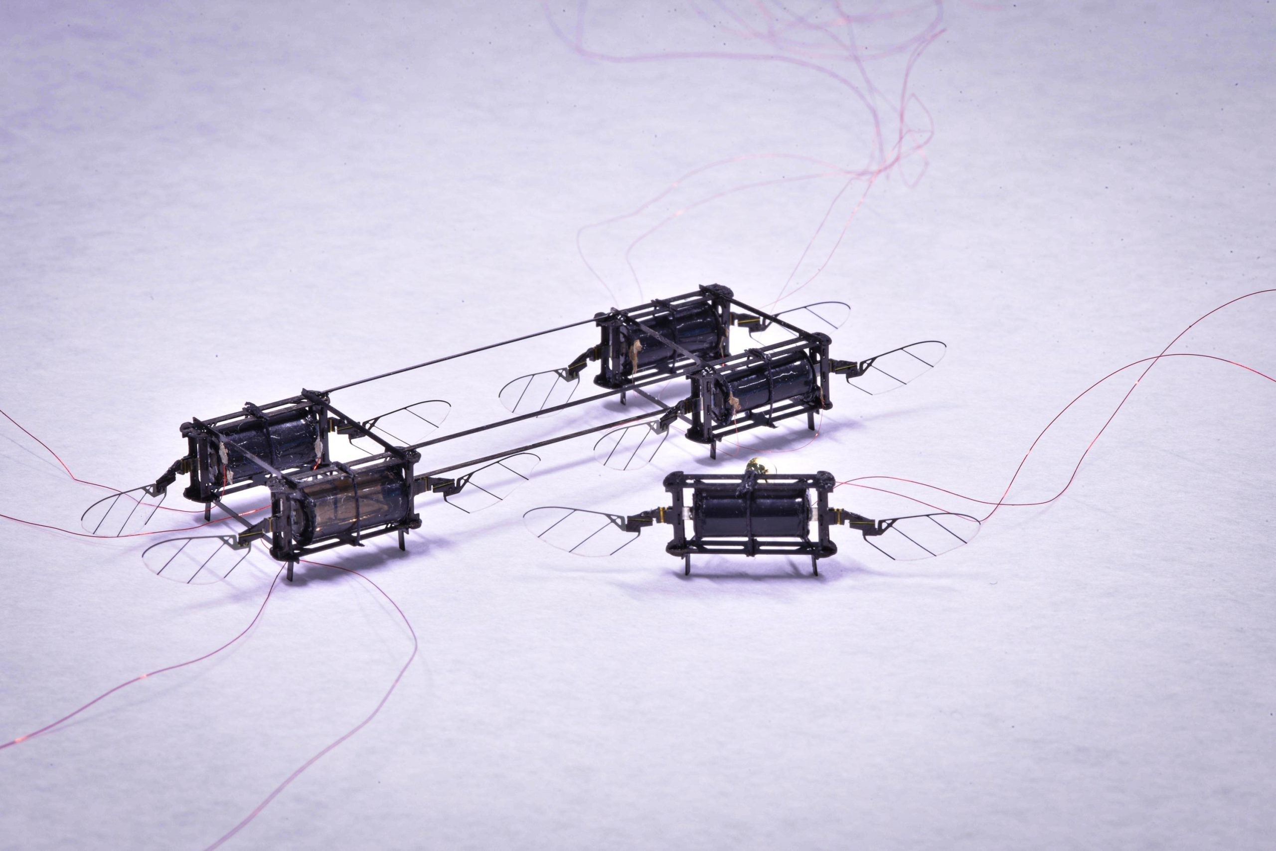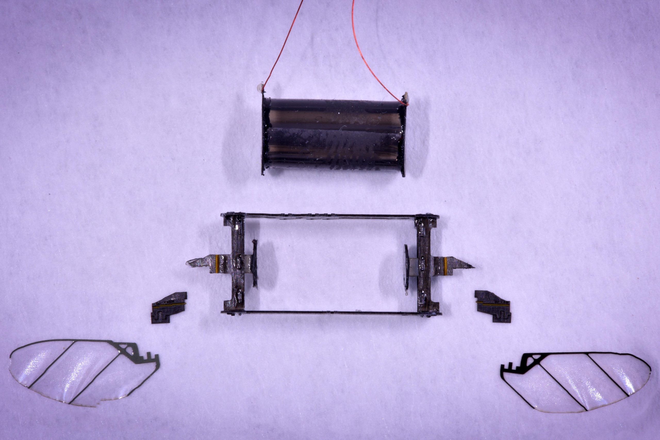 Прямоугольный микроробот, который весит менее 1 грамма, имеет четыре набора крыльев, каждый из которых приводится в движение мягким приводом. Эти мускулистые приводы сделаны из слоев эластомера, которые зажаты между двумя очень тонкими электродами и затем свернуты в мягкий цилиндр. Когда на привод подается напряжение, электроды сжимают эластомер, и это механическое напряжение используется для взмахивания крыла.