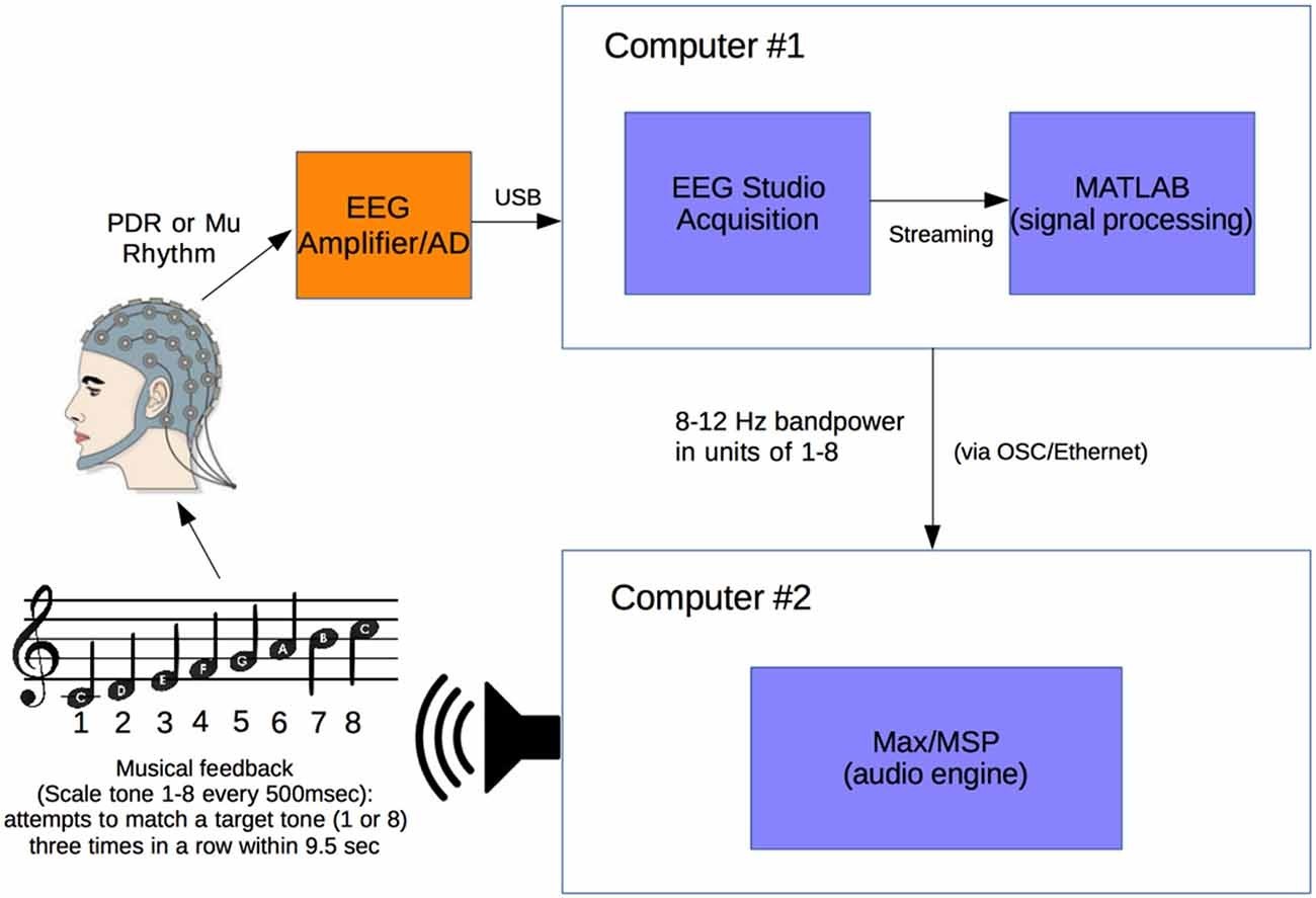 В исследовании приняли участие 15 здоровых людей. Ученые попросили их надеть специальную шапочку для проведения электроэнцефалографии (ЭЭГ). Присоединенные к ней электроды регистрировали электрическую активность в разных точках мозга. Устройство фиксировало два вида сигналов: когда человек закрывал глаза (то есть сигналы, связанные со зрительной корой), и когда участник думал о движении. Шапочка превращала мозговые сигналы в ноты, которые затем воспроизводил синтезатор.