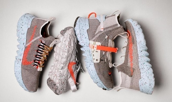 Компания Nike решила пойти немного дальше Adidas с их x Parley, которые были изготовлены из переработанного пластика. «Космический хиппи» изготавливается из тканой пряжи. В её состав входят переработанные пластиковые бутылки, выброшенные футболки и обрезки шерстяной пряжи. Также в ход пошли и отходы производства самой компании Nike. К примеру, стельки для Space Hippie состоят из отходов пены Nike ZoomX, которая используется при изготовлении беговых кроссовок Vaporfly 4. Подошва состоит целиком из вещества Crater Foam.