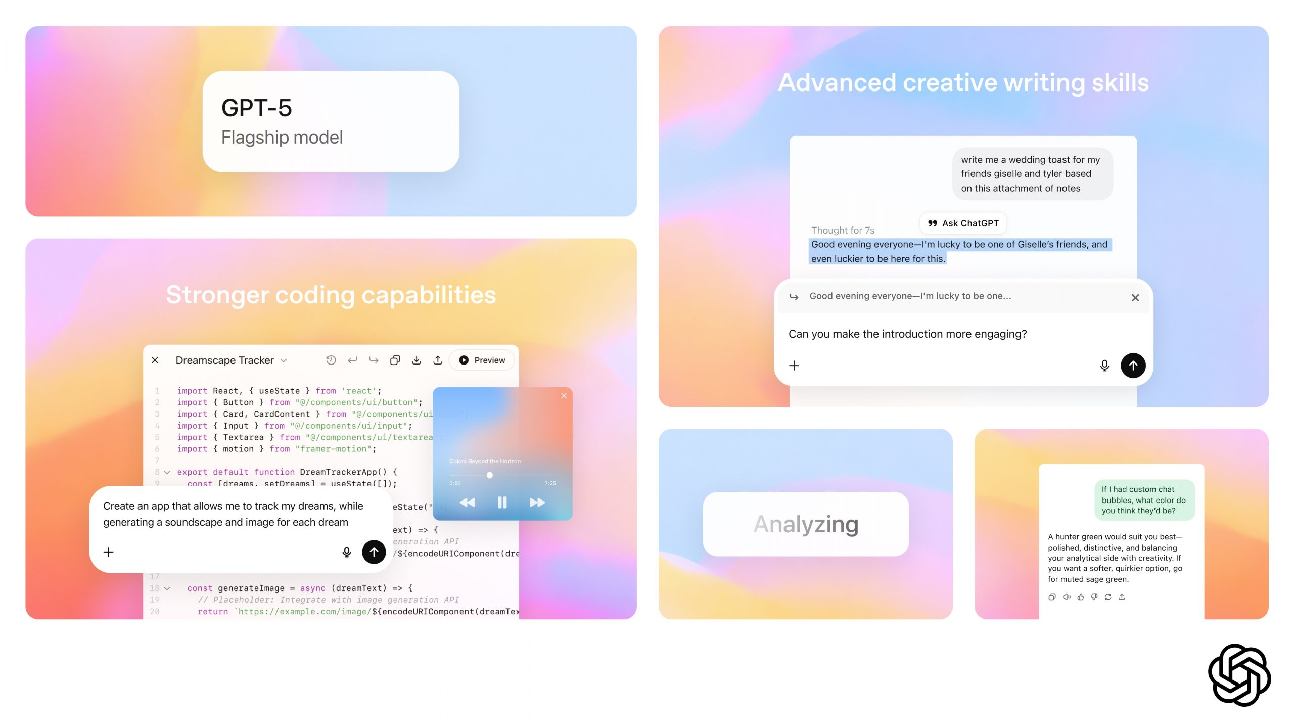 По творческим задачам — написанию текстов и дизайну — GPT-5 демонстрирует «более естественные и вкусные» ответы. Кроме того, он лучше понимает границу между безопасным и вредоносным запросом, точнее фильтруя попытки использовать ИИ во вред, не мешая при этом добросовестным пользователям.