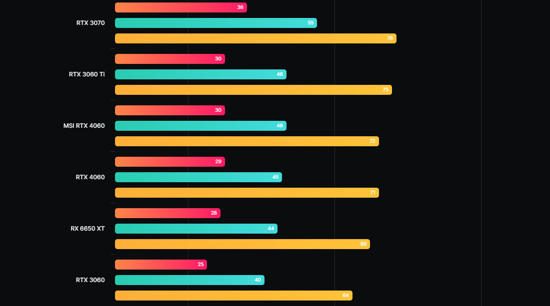 Игровая производительность новинки, а именно на геймеров ориентирована вся новая линейка видеокарт, также вызывает некоторые вопросы. В играх, которые не поддерживают технологии RTX, DLSS 3 и дорисовку кадров, нередки ситуации, когда производительность RTX 4060 остается на уровне близком к RTX 3060.