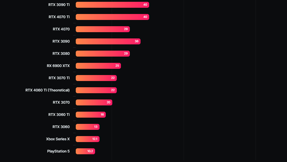 Используя слухи о «эталонной» частоте NVIDIA GeForce RTX 4060 Ti должна предложить около 22 терафлопс вычислительной производительности, а модели с разгоном повышают ее почти до 24 терафлопс.