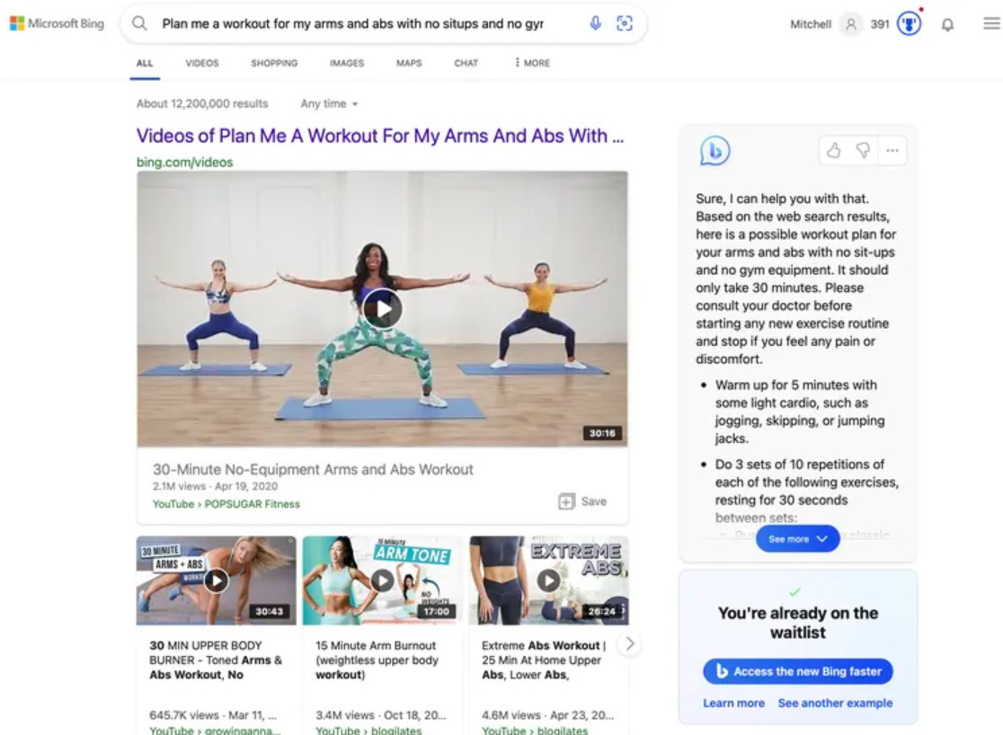 Если вы используете английскую версию Bing.com, то на главной странице увидите несколько примеров поисковых запросов, которые продемонстрируют вам механизм работы новой поисковой системы. Нажав на них, вы попадете на страницу поиска Bing с традиционными результатами слева и в окно чата справа с ответом, сгенерированным ИИ. Пока у вас не будет полного доступа, вы не сможете задавать дополнительные вопросы или уточнять результаты. Поиск по вашему собственному запросу даст вам традиционные результаты поиска Bing, несмотря на то, что домашняя страница использует новый пользовательский интерфейс в стиле чата.