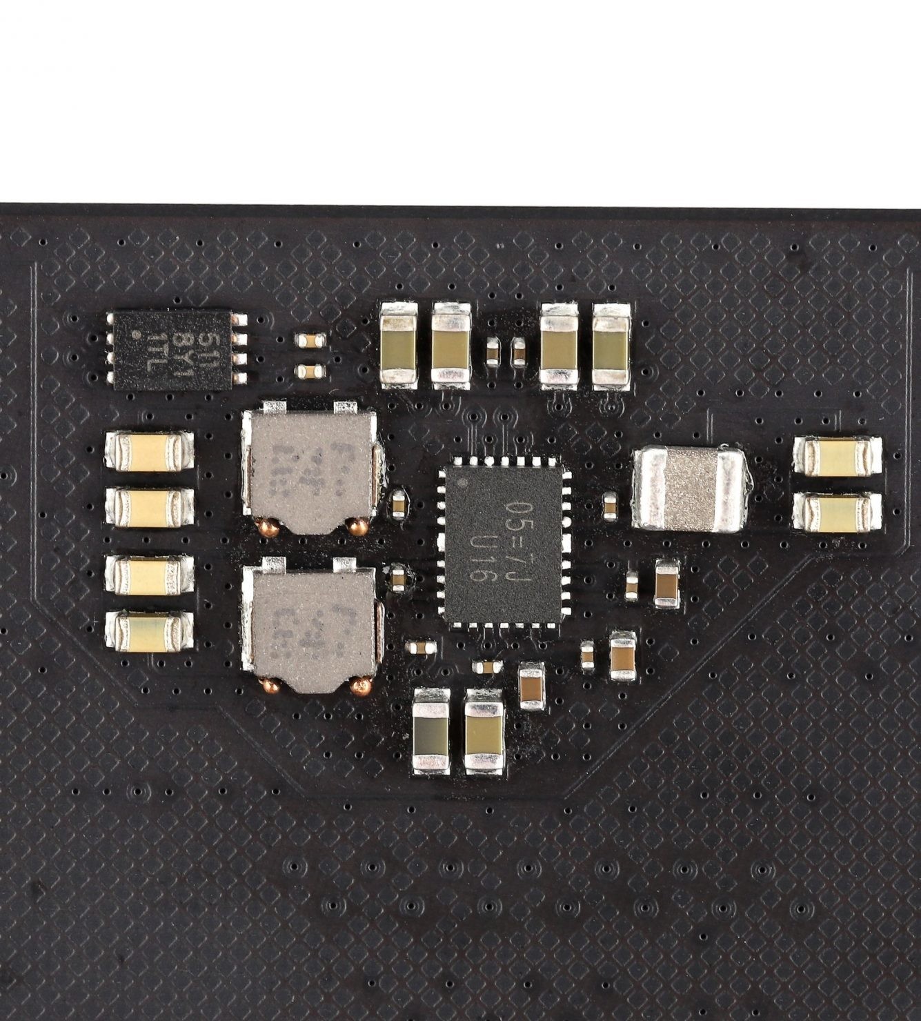 Самым важным отличием стандарта DDR5 от всех предшественников является наличие PMIC — встроенной интегральной схемы управления питанием. Схема получает питание в 5V напрямую с материнской платы и самостоятельно занимается распределением напряжения по чипам DRAM. Это небольшое, как может показаться, изменение позволяет повысить надежность модуля при больших нагрузках.