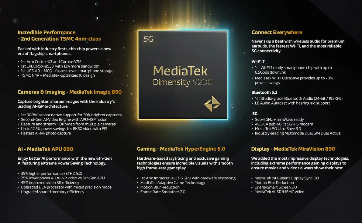 Чипсет построен на 4-нм техпроцессе TSMC второго поколения и поддерживает память LPDDR5X со скоростью до 8533 Мбит/с, а также более быстрое хранилище UFS 4.0.