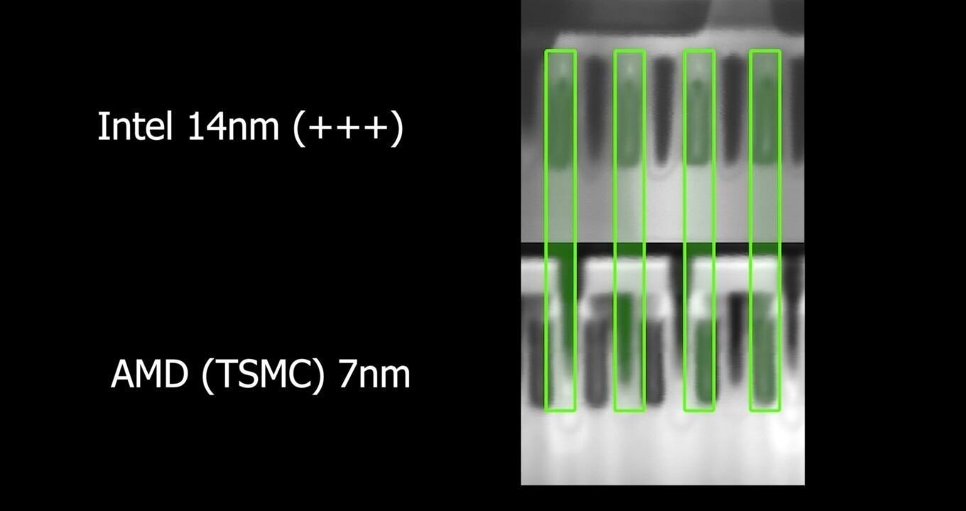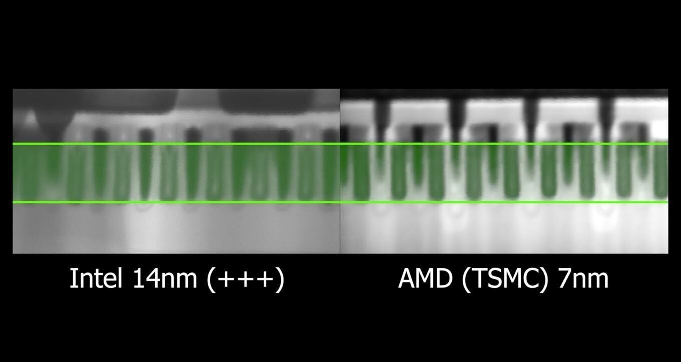 Результат сравнению получился крайне любопытным. Вышло так, что «устаревший» 14-нм чип Intel имеет транзисторы с шириной затвора 24 нм, а «продвинутый» 7-нм чип AMD / TSMC имеет ширину затвора 22 нм. Высота затворов отличается менее чем на 1 нм.