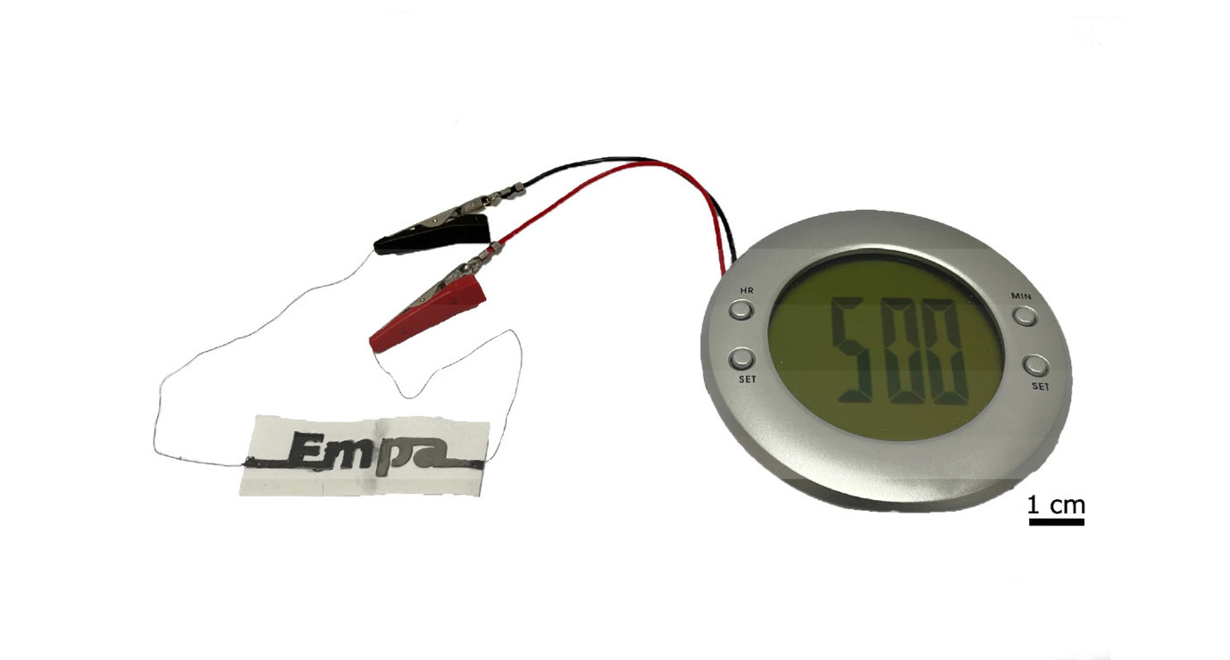 Присоединение проводов к электрическому устройству замыкает цепь, так что электроны могут передаваться от отрицательного конца — через чернила, провода и устройство, содержащие графит и сажу, — к положительному концу (чернила, содержащие графит), где они переходят в кислород окружающего воздуха. Эти реакции генерируют электрический ток, который можно использовать для питания устройства.