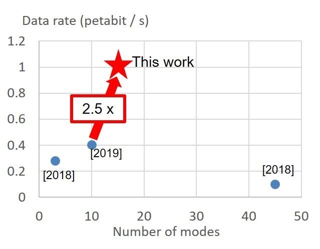 Группа исследователей из Института исследования сетевых систем Национального института информационных и коммуникационных технологий (NICT, Япония) под руководством Георга Радемахера, NOKIA Bell Labs (Bell Labs, США) под руководством Николаса К. Фонтейна и Prysimian Group (Prysimian, США). Франция) во главе с Пьером Силлардом впервые в мире удалось передать скорость более 1 петабита в секунду в одномодовом многомодовом оптоволокне. Это увеличивает передачу текущей записи в многомодовом волокне в 2,5 раза.