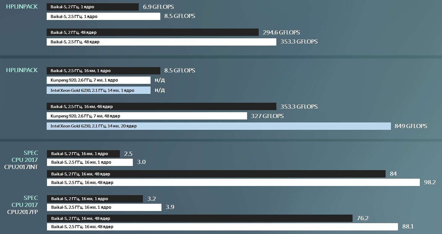 Весьма неплохие характеристики не являются бравадой, ведь согласно результатам тестирования отечественная новинка превосходит Intel Xeon Gold 6230 и лишь немного уступает Huawei Kunpeng 920. Хотя, с указанными результатами не все так гладко, как отмечают специалисты по компьютерным вычислениям.