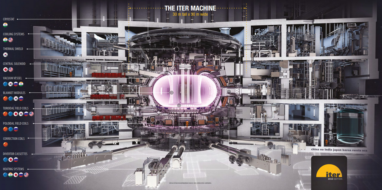 Проект ITER — это плод сотрудничества 35 стран-партнеров: Европейского Союза (плюс Великобритания и Швейцария), Китая, Индии, Японии, Кореи, России и США. Большая часть финансирования ITER поступает в виде произведенных компонентов. Эта договоренность побуждает такие компании, как General Atomics, расширять свой опыт в области футуристических технологий, необходимых для термоядерного синтеза.
