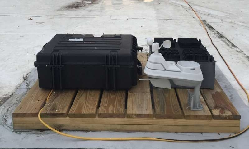 Прототип устройства, которое провело несколько месяцев на крыше здания MIT и использовалось для доказательства состоятельности технологии. Термальный резонатор — это черный ящик справа. Также здесь присутствует система мониторинга погоды (белая) и набор оборудования для отслеживания производительности системы (черный пластиковый чемодан слева)
