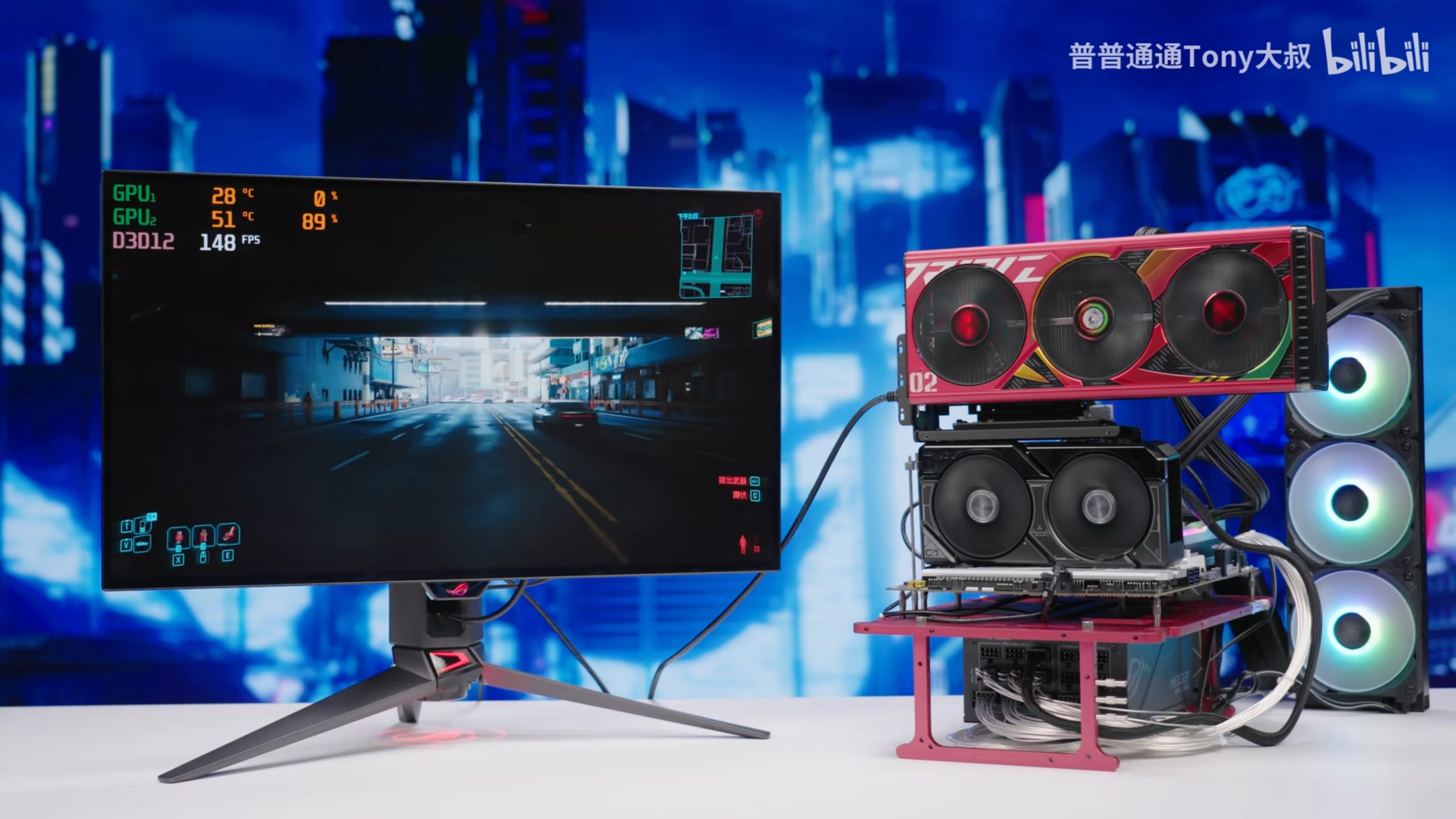 Тони также продемонстрировал подключение полноценного графического процессора к слоту M.2. В этом случае использовалась карта Evangelion GeForce RTX 4090 от ASUS. Интересно, что она успешно работала с использованием слота M.2 4060 Ti, который способен преобразовывать линии x8 в канал Gen5 x4. Это открывает возможности для расширенного использования eGPU или дополнительной карты в проектах SFF.