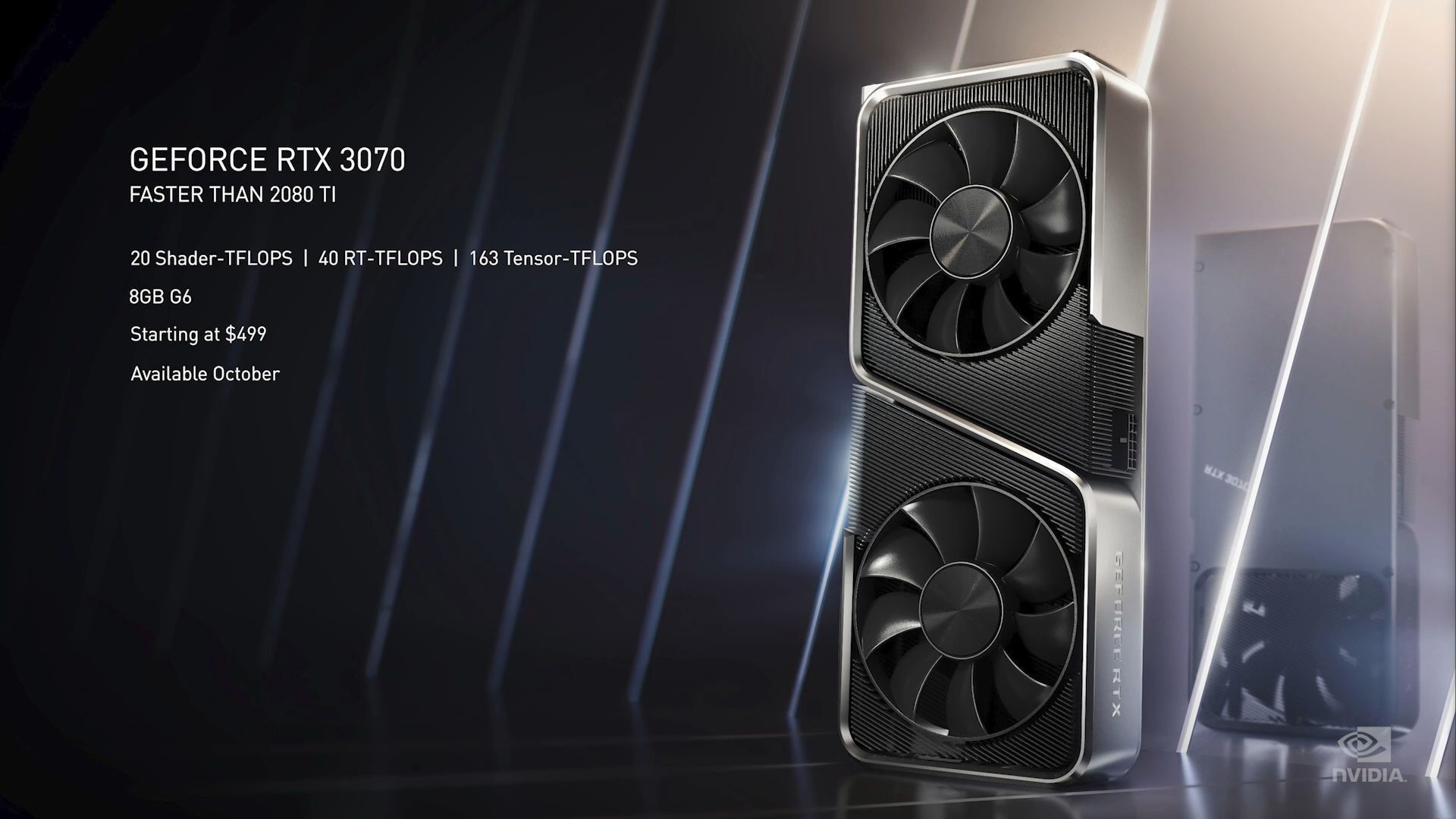 Младшей в линейке на данный момент является GeForce RTX 3070. Она отличается от двух топовых решений немного урезанным процессором, шиной в 256 бит (против 320 у 3080 и 384 у 3090) и вдвое меньшим числом CUDA-ядер (в сравнении с флагманом линейки). Однако, если верить всё тем же результатам сравнения производительности представленным самой Nvidia, производительность новинки чуть выше чем у RTX 2080Ti, что с учётом низкой стоимости делает её крайне интересным вариантом для покупки.