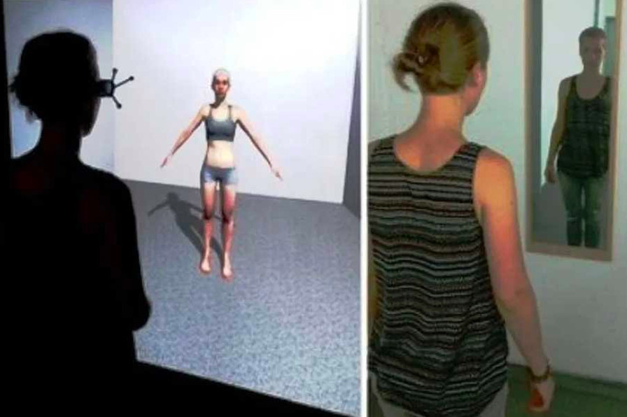 Нескольким десяткам добровольцев было предложено погрузиться в виртуальную реальность и в режиме от первого и от третьего лица рассмотреть как своё текущее тело, так и его идеализированные версии. В частности, была приложена версия, соответствующая «идеальным» пропорциям, по мнению самих участниц. Результаты эксперимента подтвердили, что при взгляде со стороны, участницы находили свою фигуру более привлекательной чем им казалось при взгляде на отражение в зеркало.