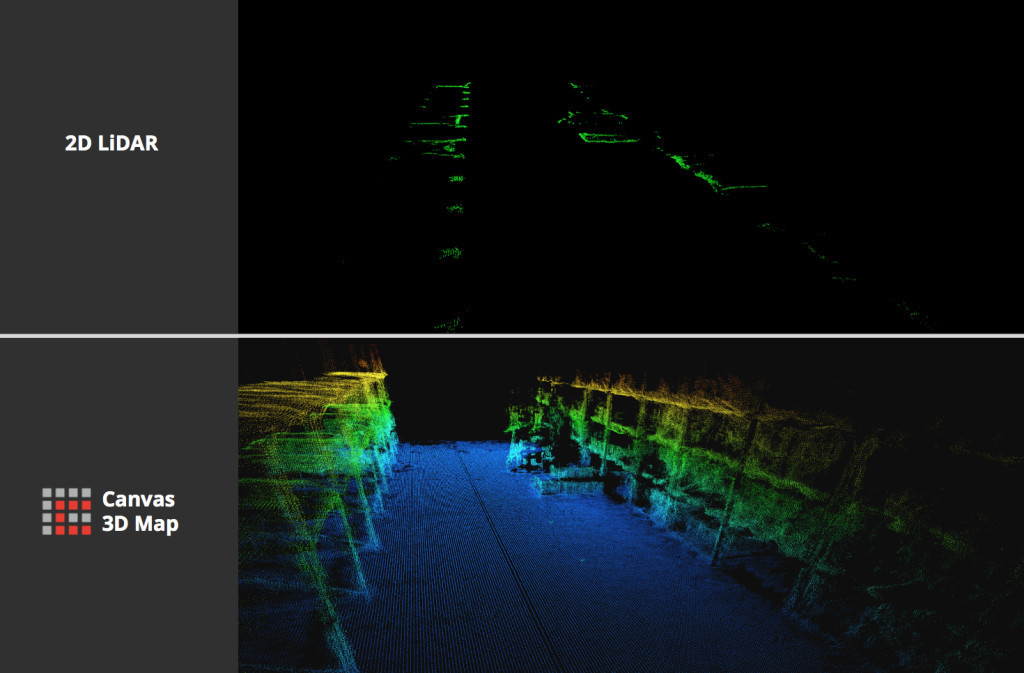 Canvas оснащена 3D-камерой, которая используется для генерации объемных карт помещений в реальном времени. Эти карты содержат гораздо больше деталей, чем традиционные, в 2D, создаваемые системами LiDAR. Эта дополнительная информация имеет решающее значение в заводской среде: она оберегает тележку от множества опасностей, таких, как столкновения и наезды.